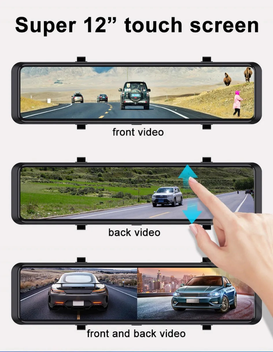 Upgrade your driving with the 12-inch Smart Mirror Dash Cam, featuring dual Full HD cameras (front & rear) and a crystal-clear IPS touchscreen display.