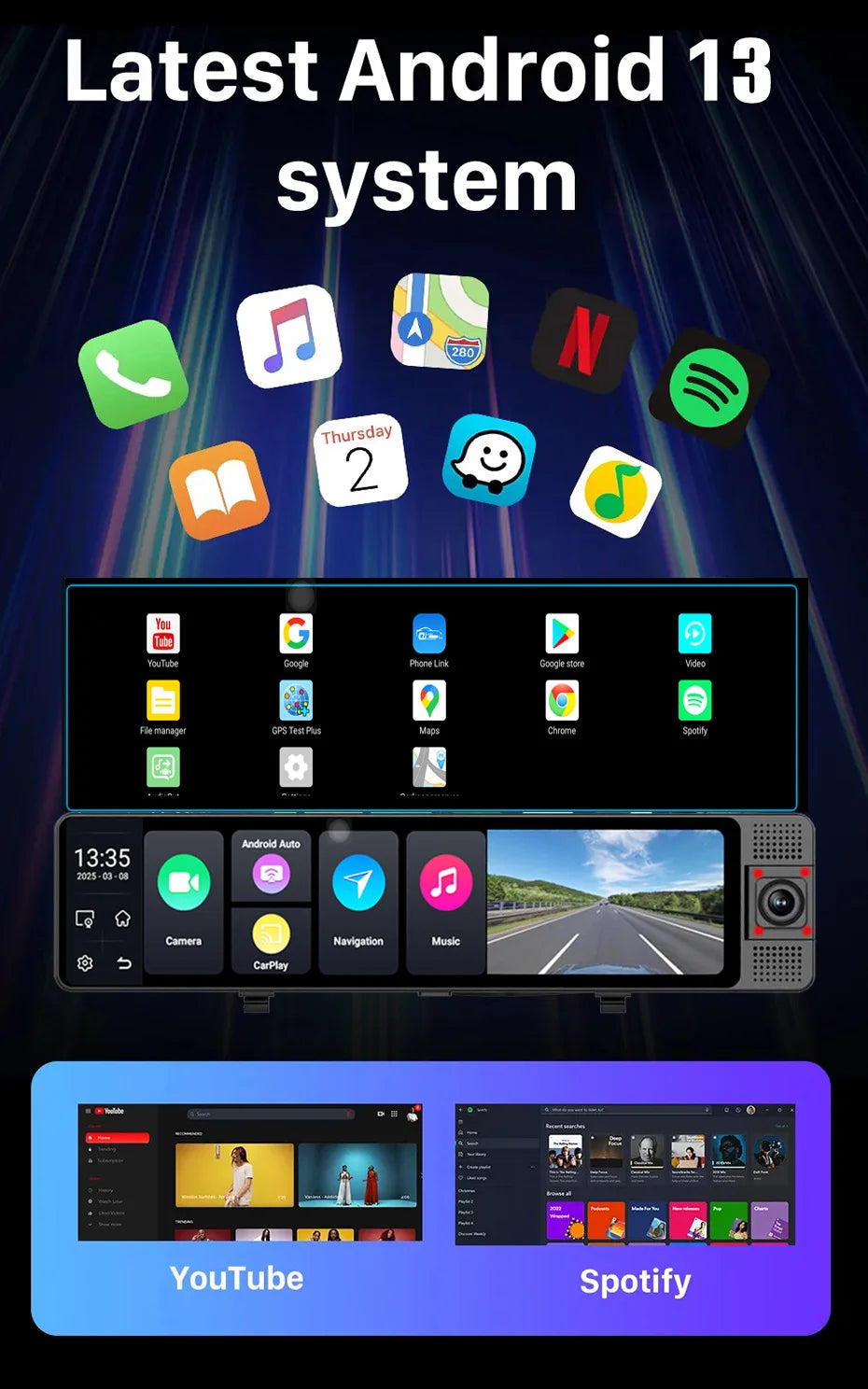 It provides full coverage ā front, cabin, and rear ā with crystal-clear quality on a wide IPS touchscreen.